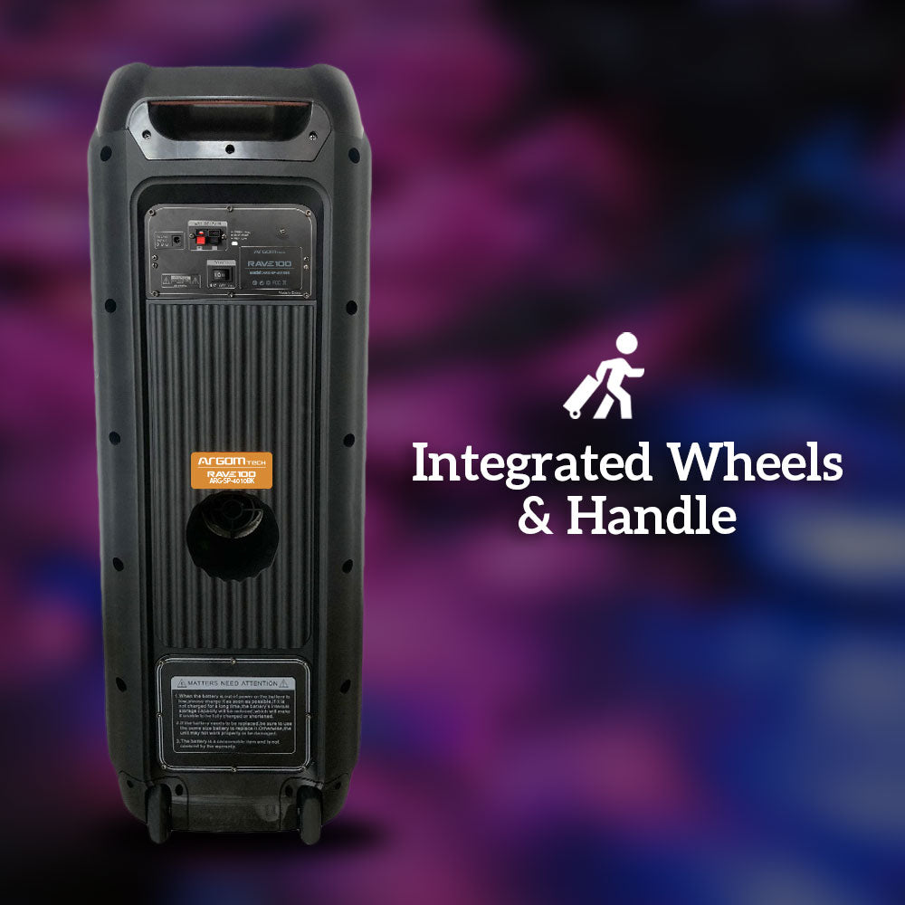 Gracias a sus ruedas integradas y asa de transporte, es fácil de mover, lo que te permite llevarlo a cualquier lugar sin esfuerzo. Su batería de 7.5Ah ofrece largas horas de entretenimiento, y si buscas aún más potencia, puedes activar la función TWS para emparejar un segundo parlante y duplicar la potencia de sonido. Este modelo también incluye dos entradas de micrófono y una entrada para guitarra, lo que lo convierte en la opción ideal para mejorar tus sesiones de karaoke o presentaciones en vivo. Por otro lado, con el parlante Rave 100, puedes personalizar tu experiencia de audio gracias al ecualizador incorporado con preajustes.